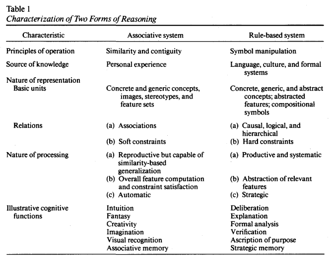The rules-based approach of REs and the fuzzy relationship-based approach of LLMs strongly reminds me of the models of the “Two Forms of Reasoning” by Sloman8. Just take a look at the descriptions that Sloman made in his 1996 paper of his “Two Forms of Reasoning”.