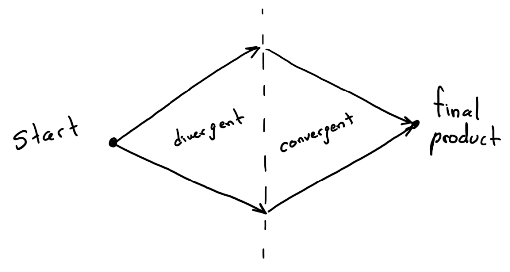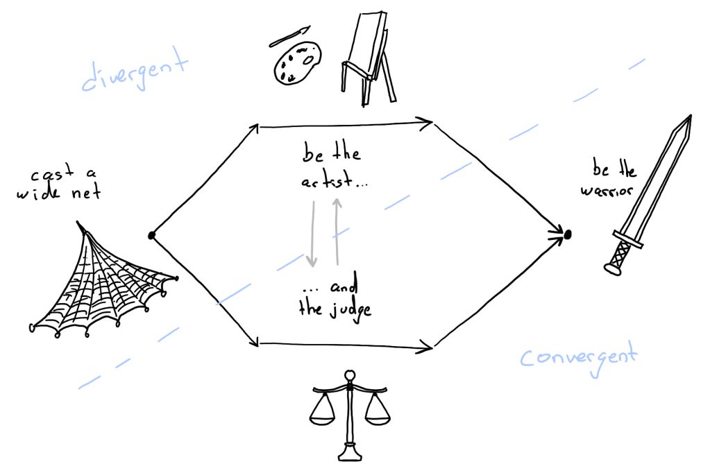 In the description of Bates, just as with Forte, you start with divergent thinking (cast a wide net, that is, have a lot of loosely connected ideas) and end with convergent thinking (be the warrior, which means argue logically for the value of your idea). The difference comes in the extra middle part. This requires you to be able to switch between your two modes of thinking; your still need the associative and intuitive part of your mind to develop your original ideas but at the same time you need to be able to recognize, logically, when something is a dead end and should be abandoned.